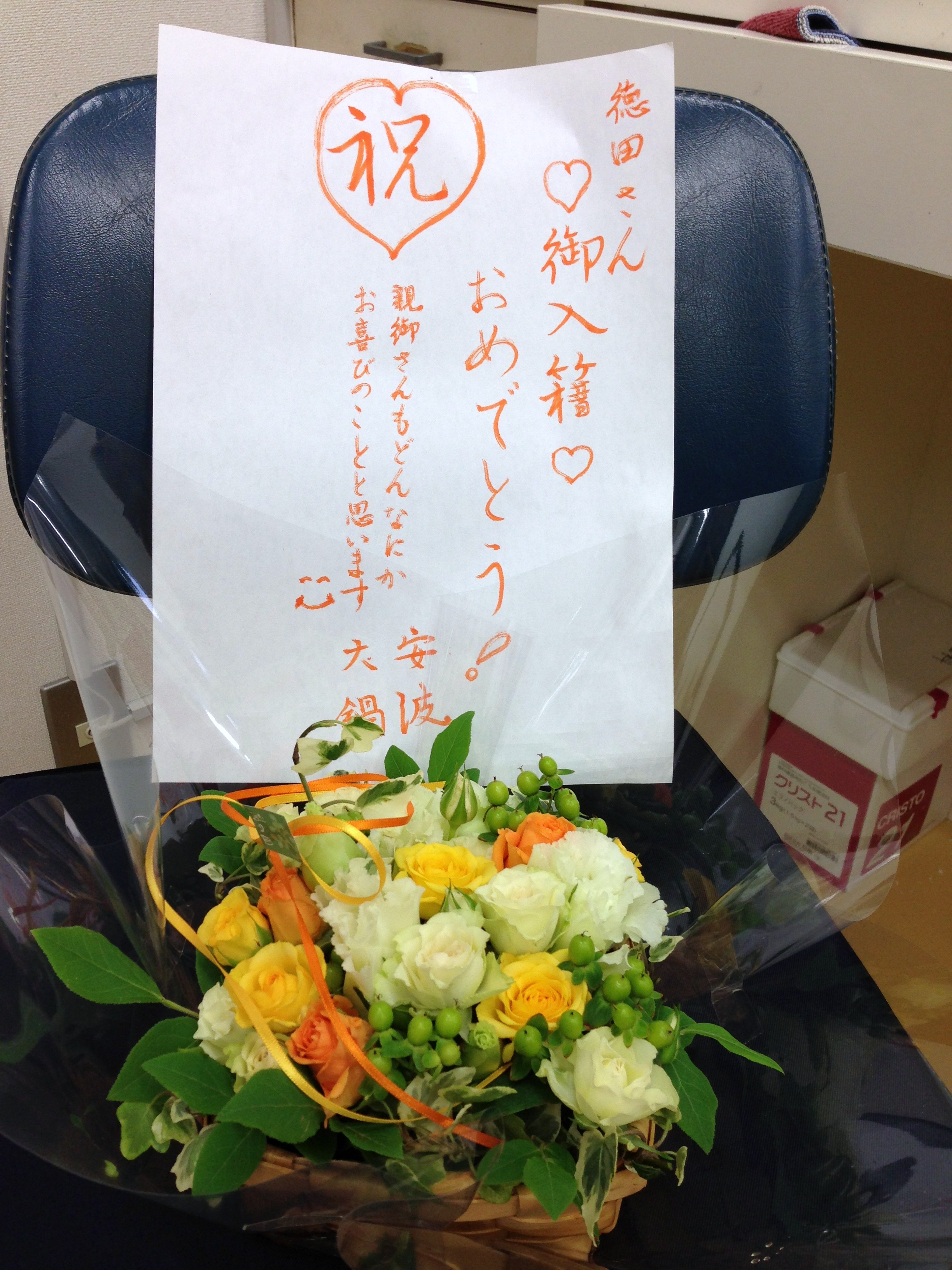 2015年7月4日 結婚しました❤ こんばんは。丸尾歯科・技工士の徳田です。 先月、入籍をすませ「池山」になりました。まだ、そう呼ばれることになれませんが・・・(*^_^*) 入籍する日、名札を作り替えてくれたり❤ わざわざ、いけばな教室で作ったお花を夕方届けてくれたり❤ スタッフからの、嬉しいサプライズがありました!!! 本当にありがたいことです。(●^o^●) まだしばらくは、正社員で頑張ります。