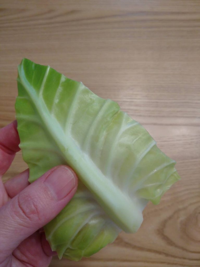 実際に食べるわけではないので、誤ってちぎれないように、大きく切って軽く茹でたものを手に持たせてあげます。