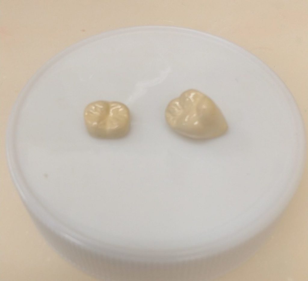 PEEK冠は透明感がないのに対し、CAD/CAM冠はレジン(プラスチック)とセラミック(陶器)を混ぜたハイブリッドレジン素材のため透明感があり、PEEK冠は色調的には劣ります。